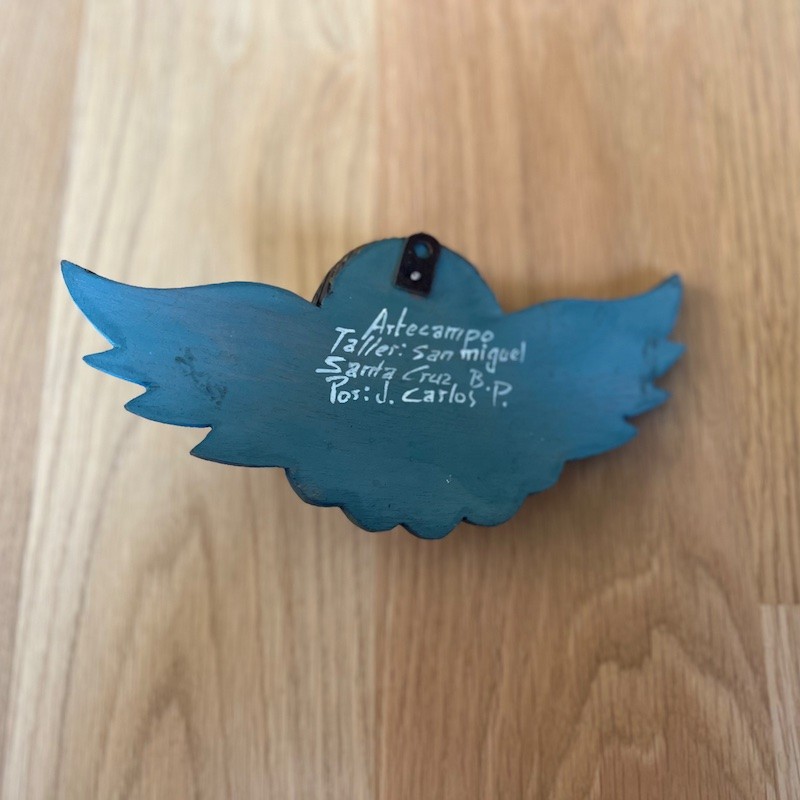 Trabajo de artesanos locales con métodos rústicos de tallado y pintado manualmente, utilizando retazos de "madera reciclada".